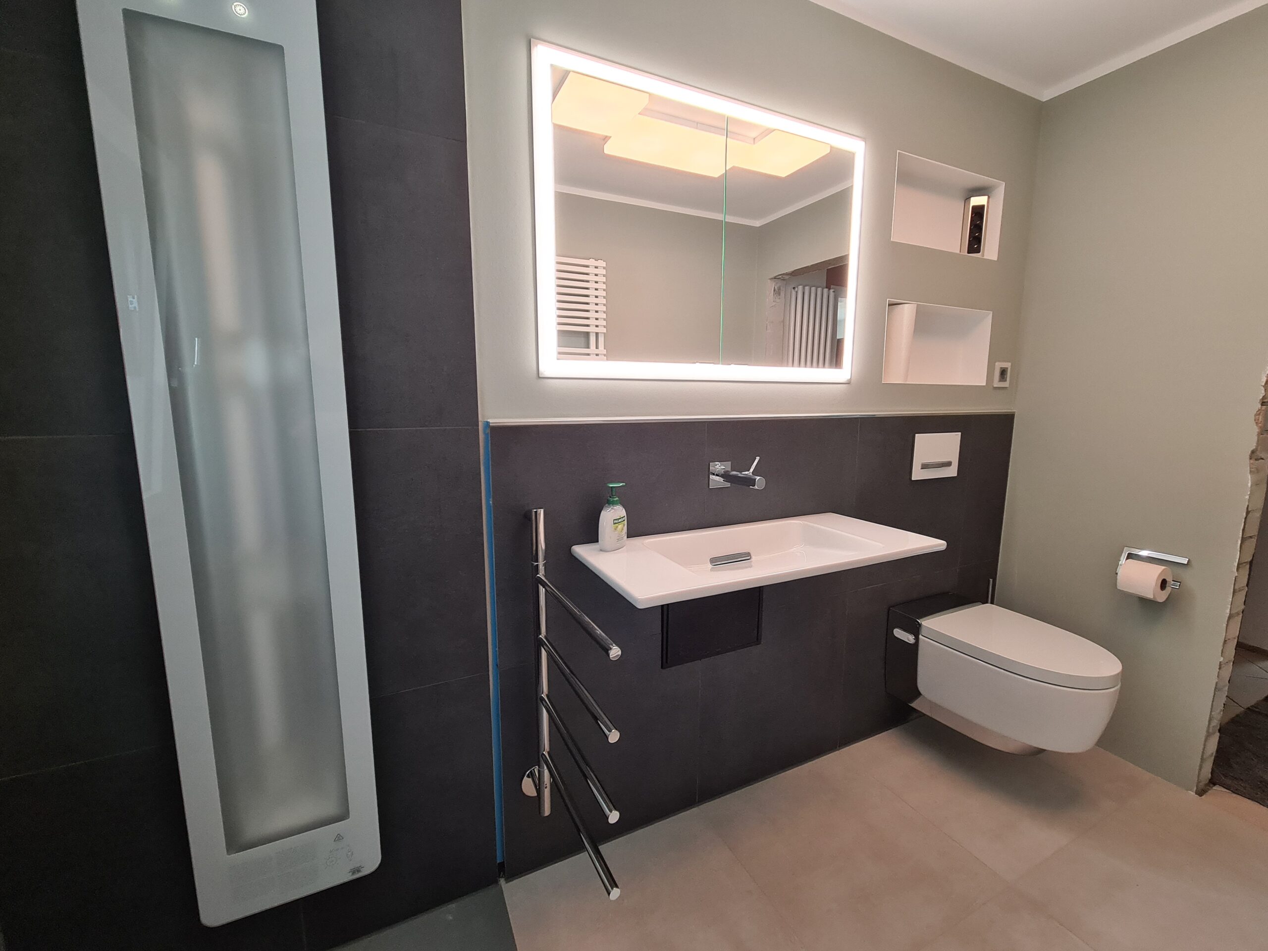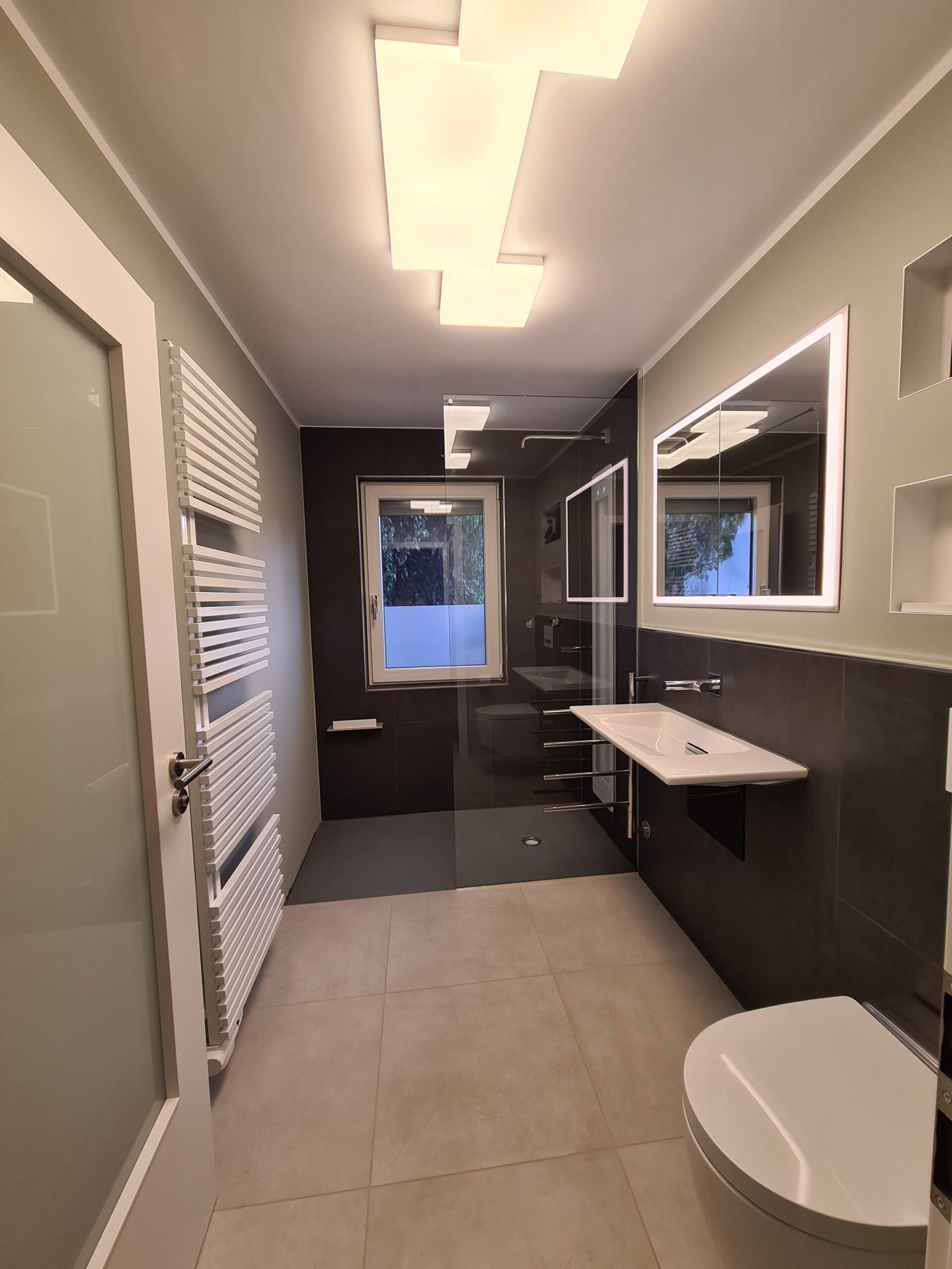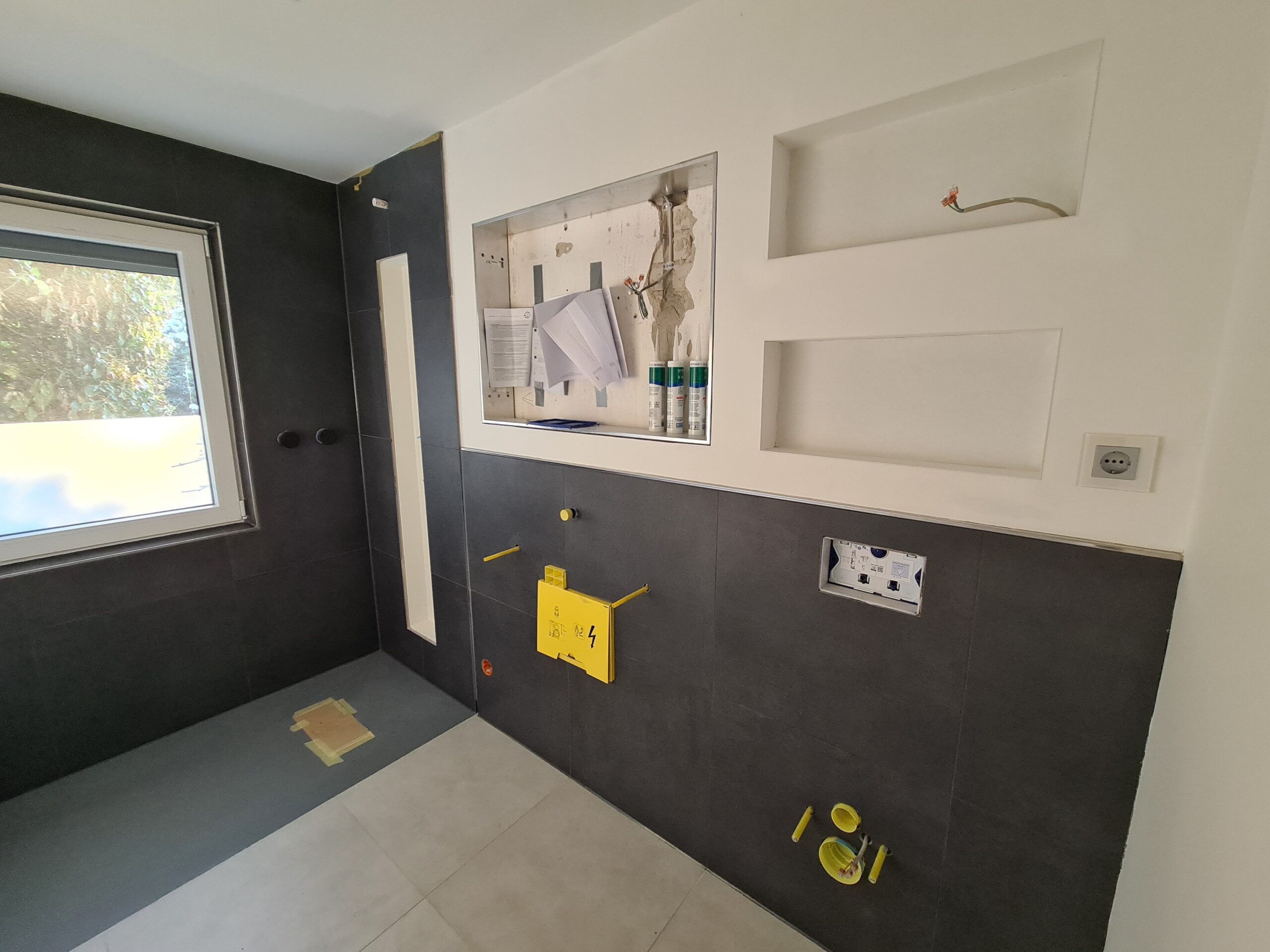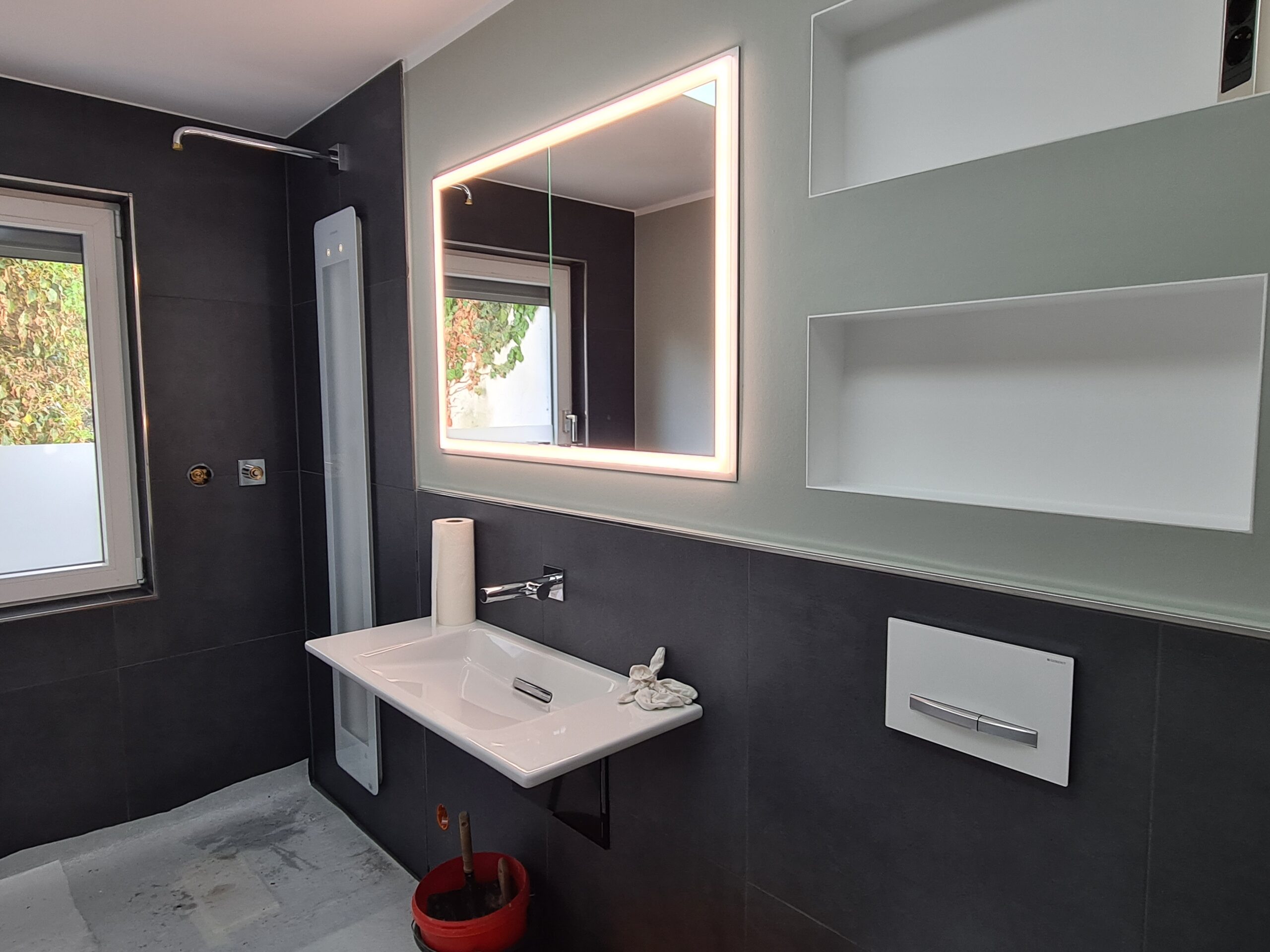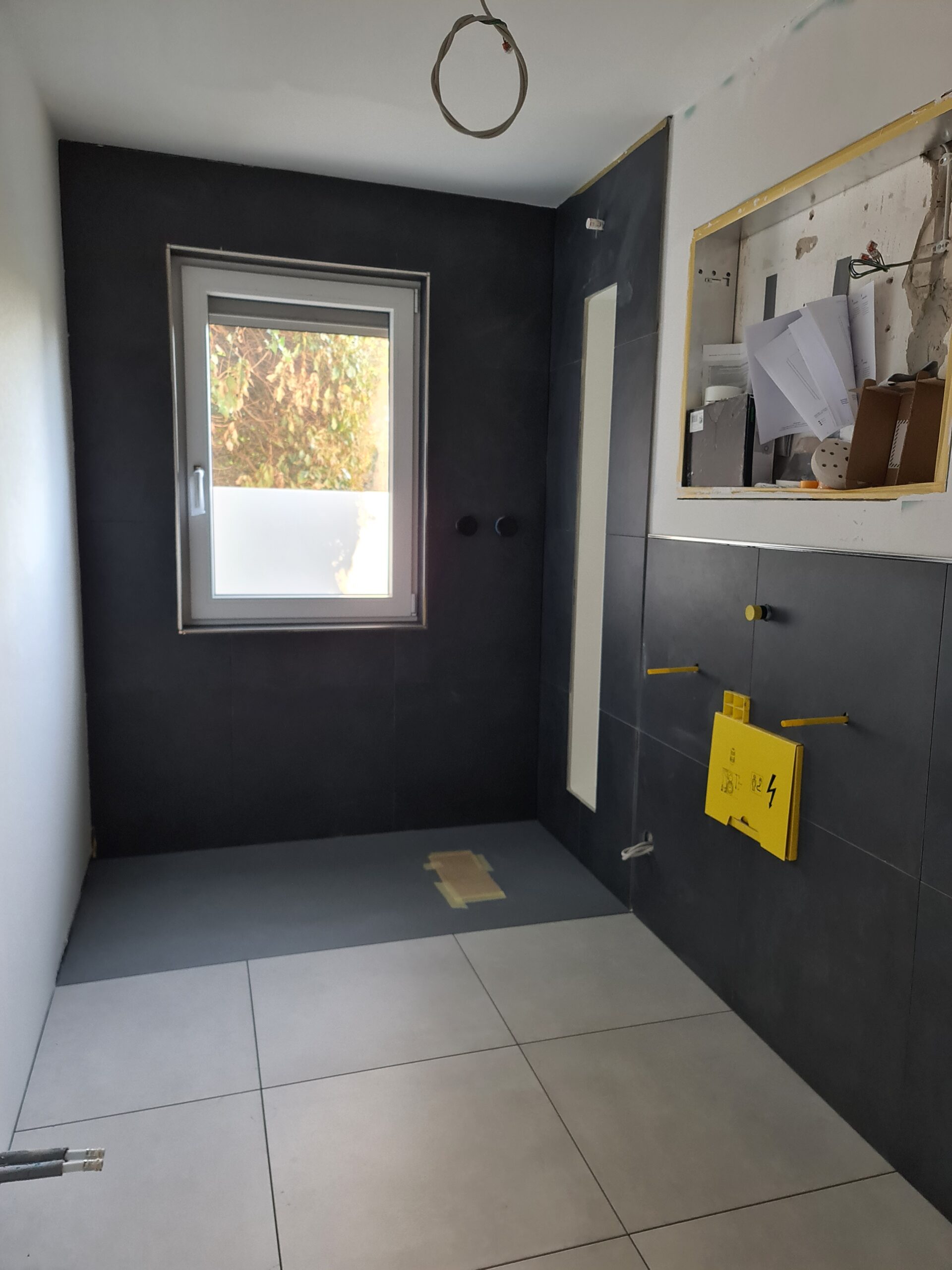 Dank der hervorragenden Zusammenarbeit aller Gewerke konnte ein Bad entstehen, das nicht nur funktional, sondern auch optisch ein echtes Highlight darstellt. Von der präzisen Fliesenverlegung über die stilvolle Malerarbeit bis hin zur Installation modernster Sanitärtechnik – jedes Detail wurde mit größter Sorgfalt umgesetzt.