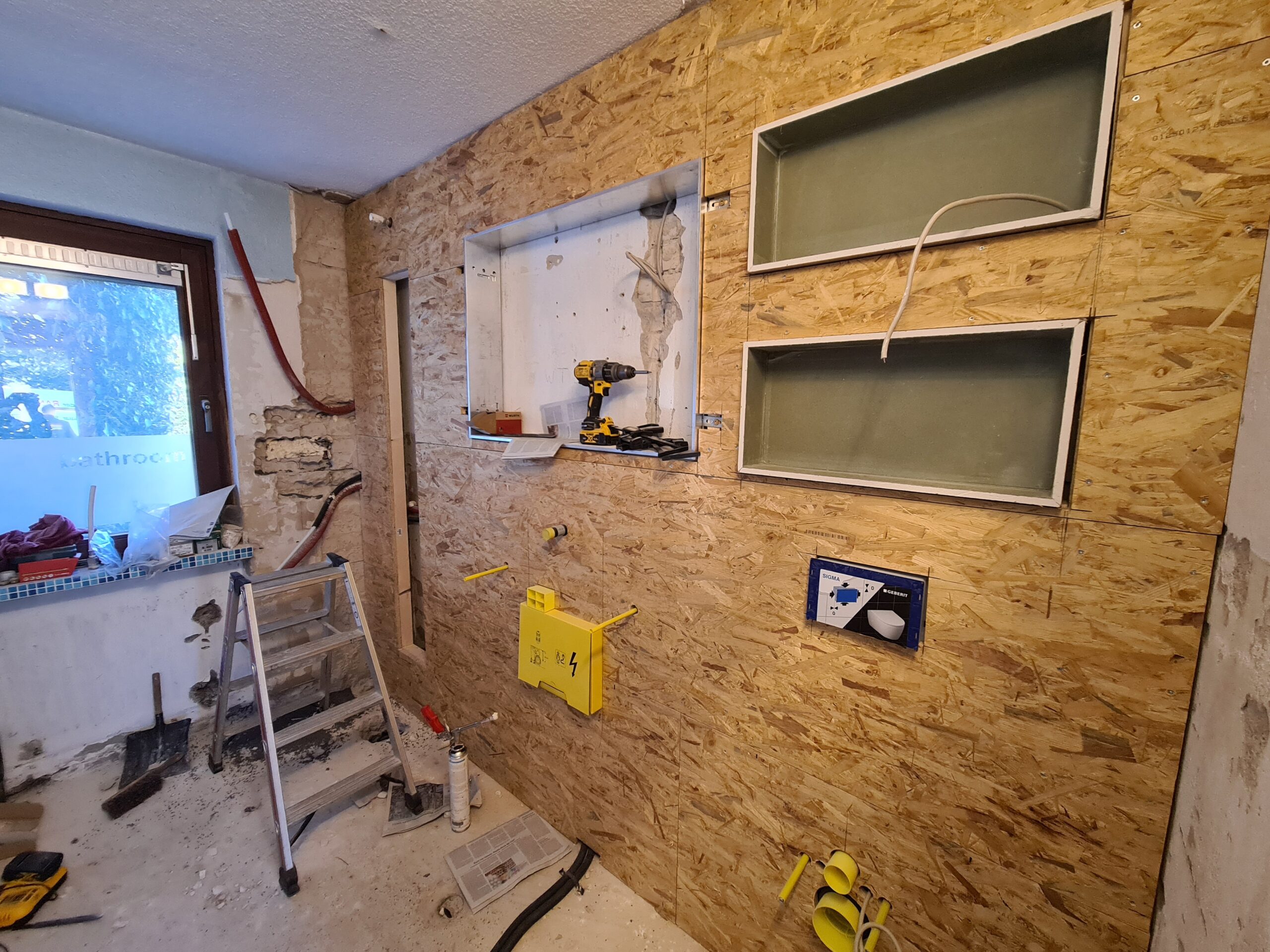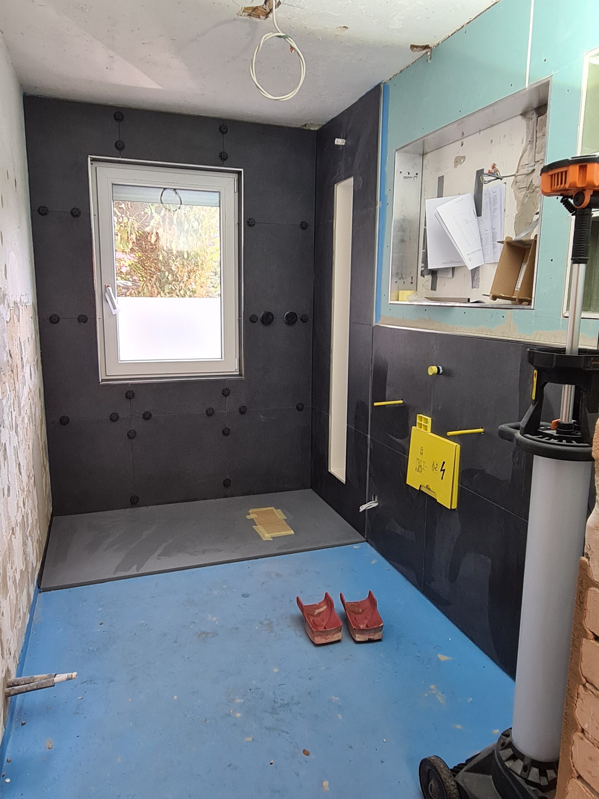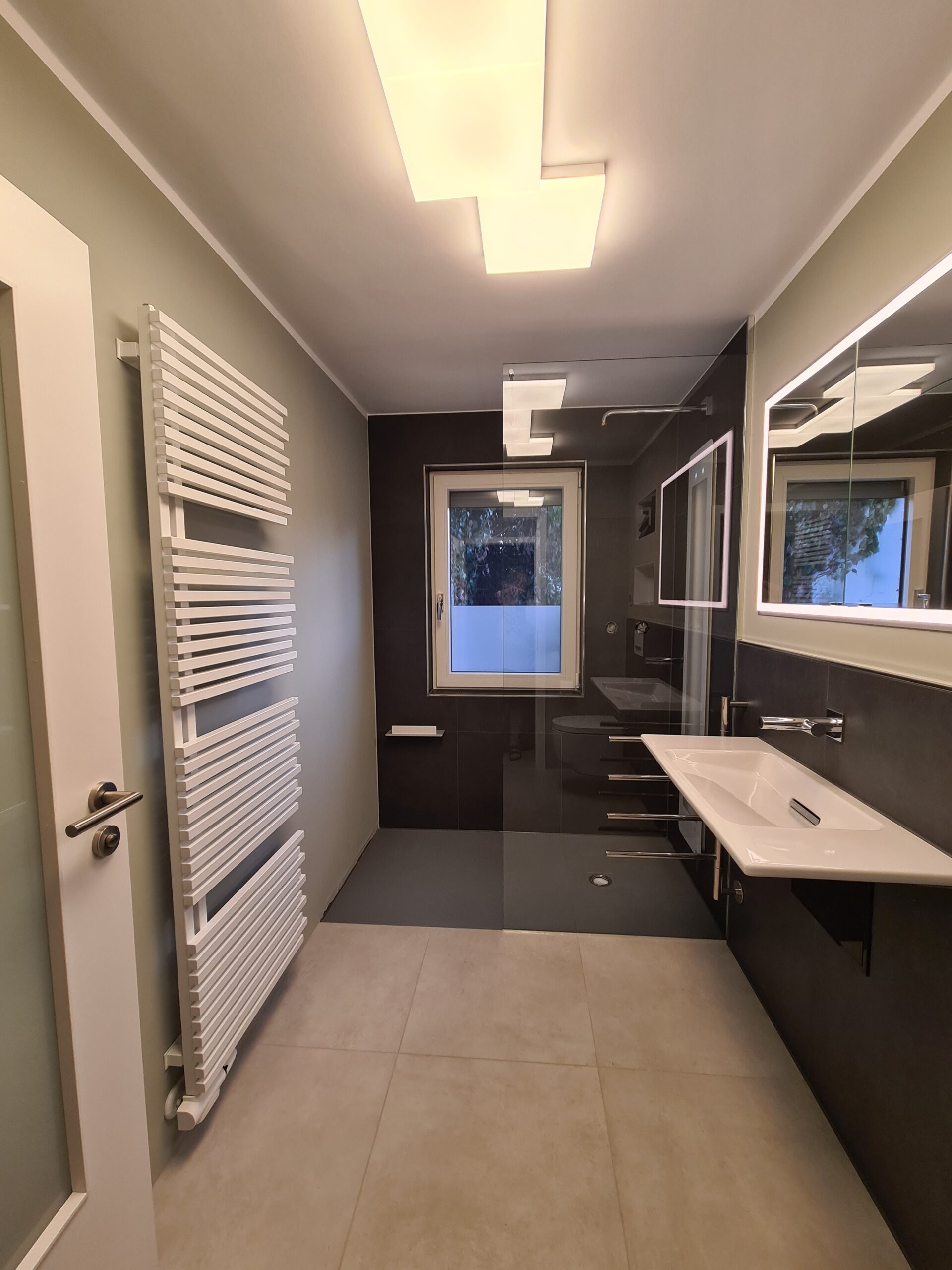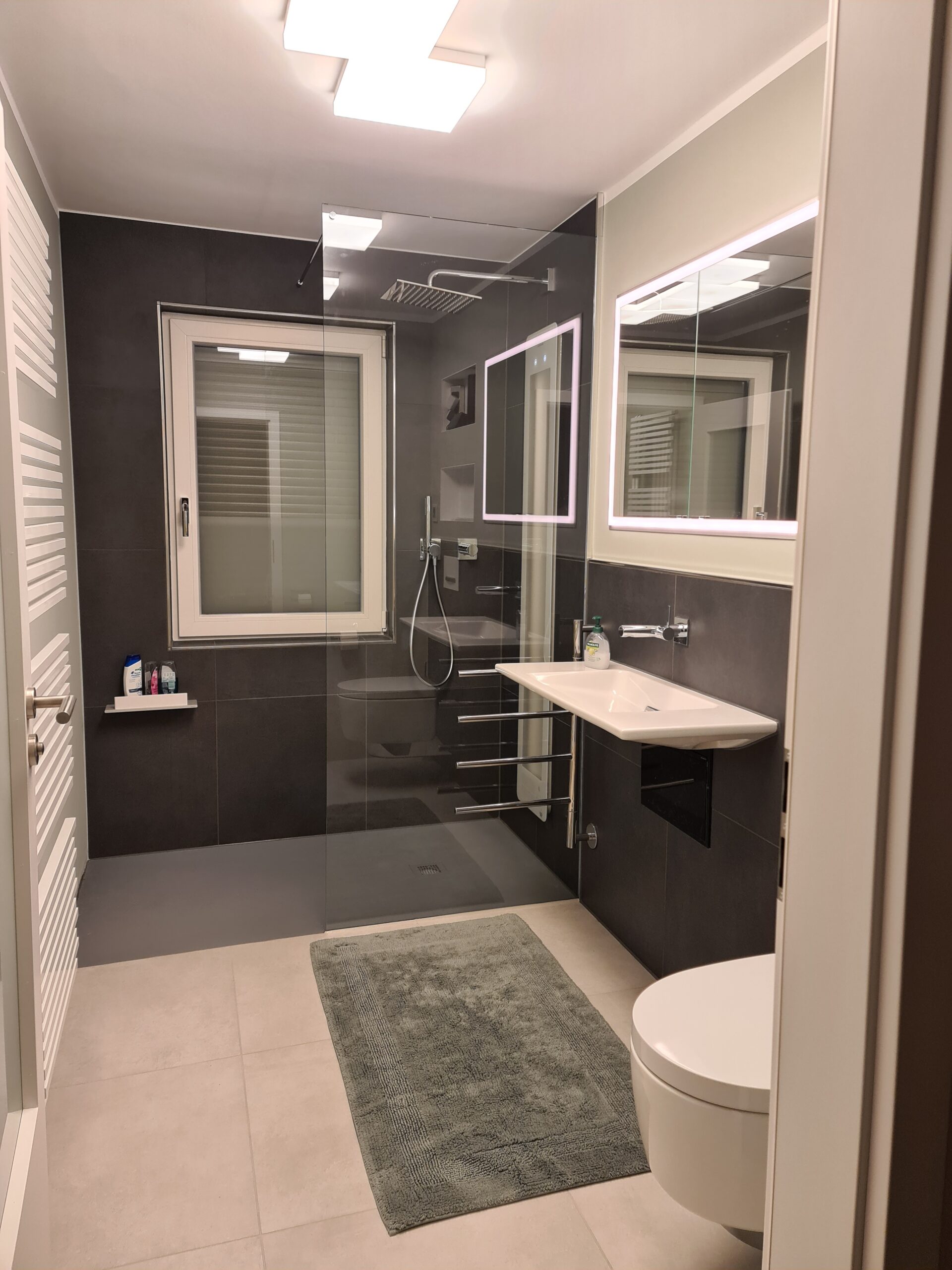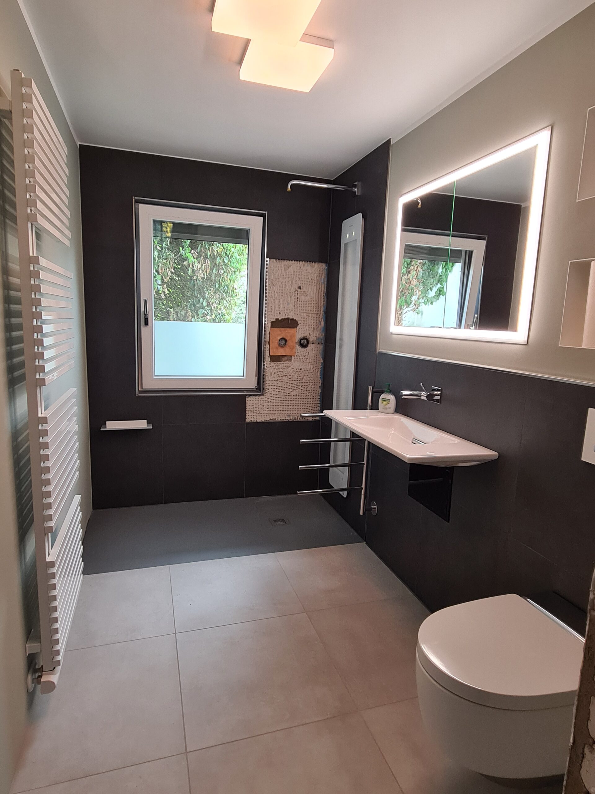 Dank der hervorragenden Zusammenarbeit aller Gewerke konnte ein Bad entstehen, das nicht nur funktional, sondern auch optisch ein echtes Highlight darstellt. Von der präzisen Fliesenverlegung über die stilvolle Malerarbeit bis hin zur Installation modernster Sanitärtechnik – jedes Detail wurde mit größter Sorgfalt umgesetzt.